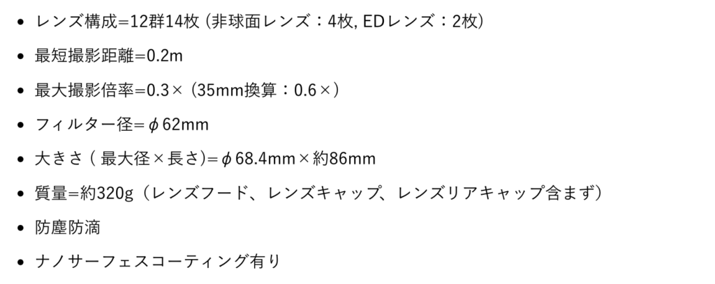 仕様を見て分かるように、このレンズの特徴は「簡易マクロ」「防塵防滴」「逆光耐性がある」と分かると思います